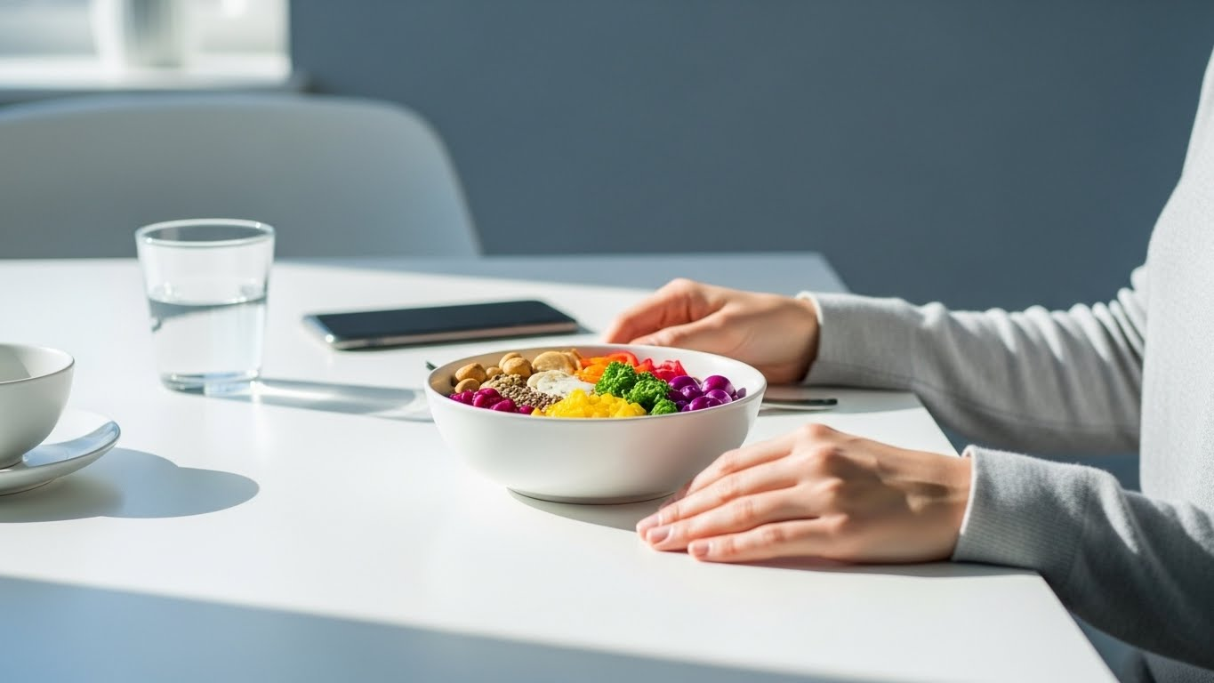 '마음챙김 식사(Mindful Eating)'는 음식을 먹는 순간에 오롯이 집중하며, 맛과 향, 질감을 음미하고 몸의 신호를 인식하는 식사법입니다. 이는 주의산만한 식사의 반대 개념으로, 스트레스 감소와 건강한 체중 유지에 큰 도움을 줍니다.