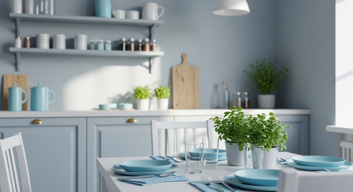 - 벽면: 연한 블루-그레이 (예: 스카이 블루, 민트 그린) 계열은 심리적 안정감을 주고 식욕을 자연스럽게 조절하는 데 도움을 줍니다.